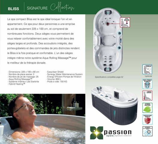 Le spa compact BLISS est le spa idéal lorsque l'on vit en appartement. Ce spa pour deux personnes a une emprise au sol de seulement 225 x 100 cm, et comprend de nombreuses fonctions. Deux sièges vous permettent de vous relaxer confortablement avec votre moitié dans des sièges larges et profonds. Des accoudoirs intégrés, des portes-gobelets et des commandes de jets distinctes rendent le Bliss à la fois pratique et confortable. L'un des sièges intègre même notre système Aqua Rolling Massage pour le meilleur de la thérapie dorsale.