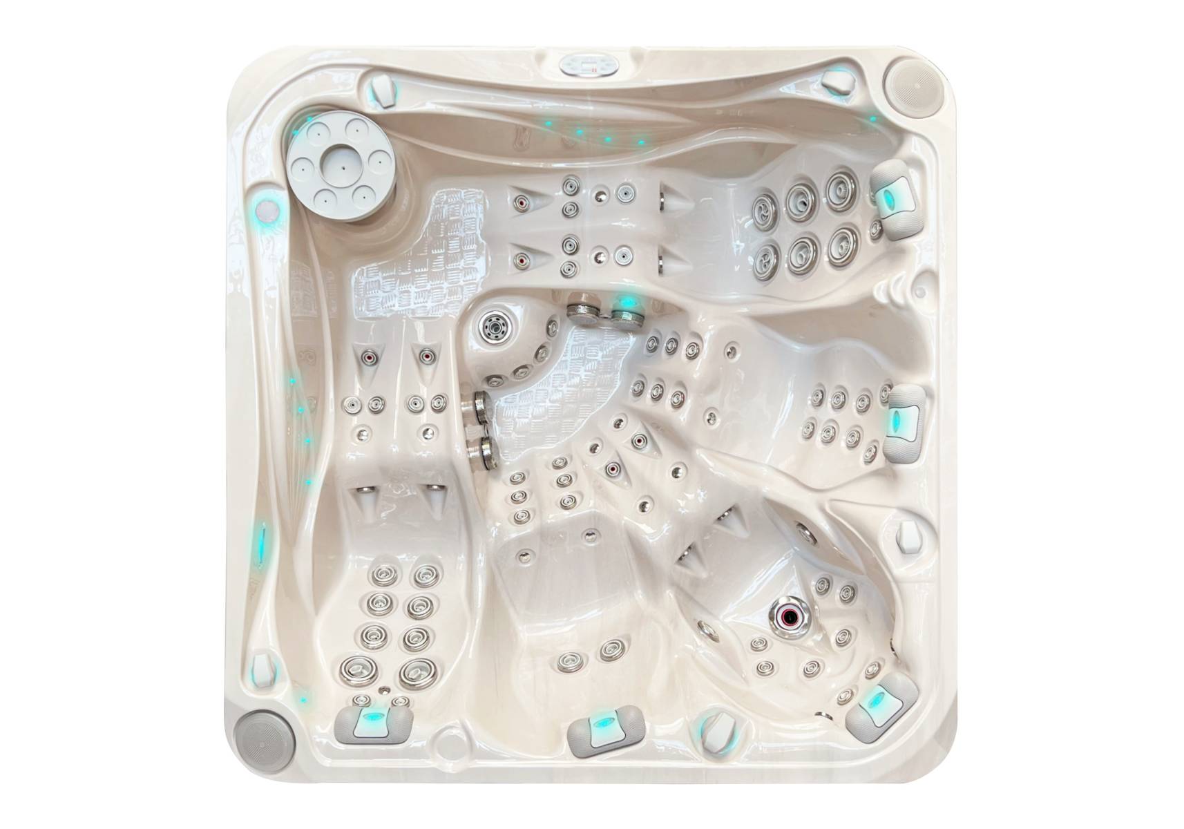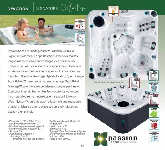 Le spa DEVOTION avec ses trois chaises longues et ses deux places allongées est livré en standard avec des caractéristiques exclusives telles que le chauffage Hybride Heating et l'Aqua Rollong Massage offre une thérapie spécialement conçue pour lisser du haut en bas des muscles du cou.