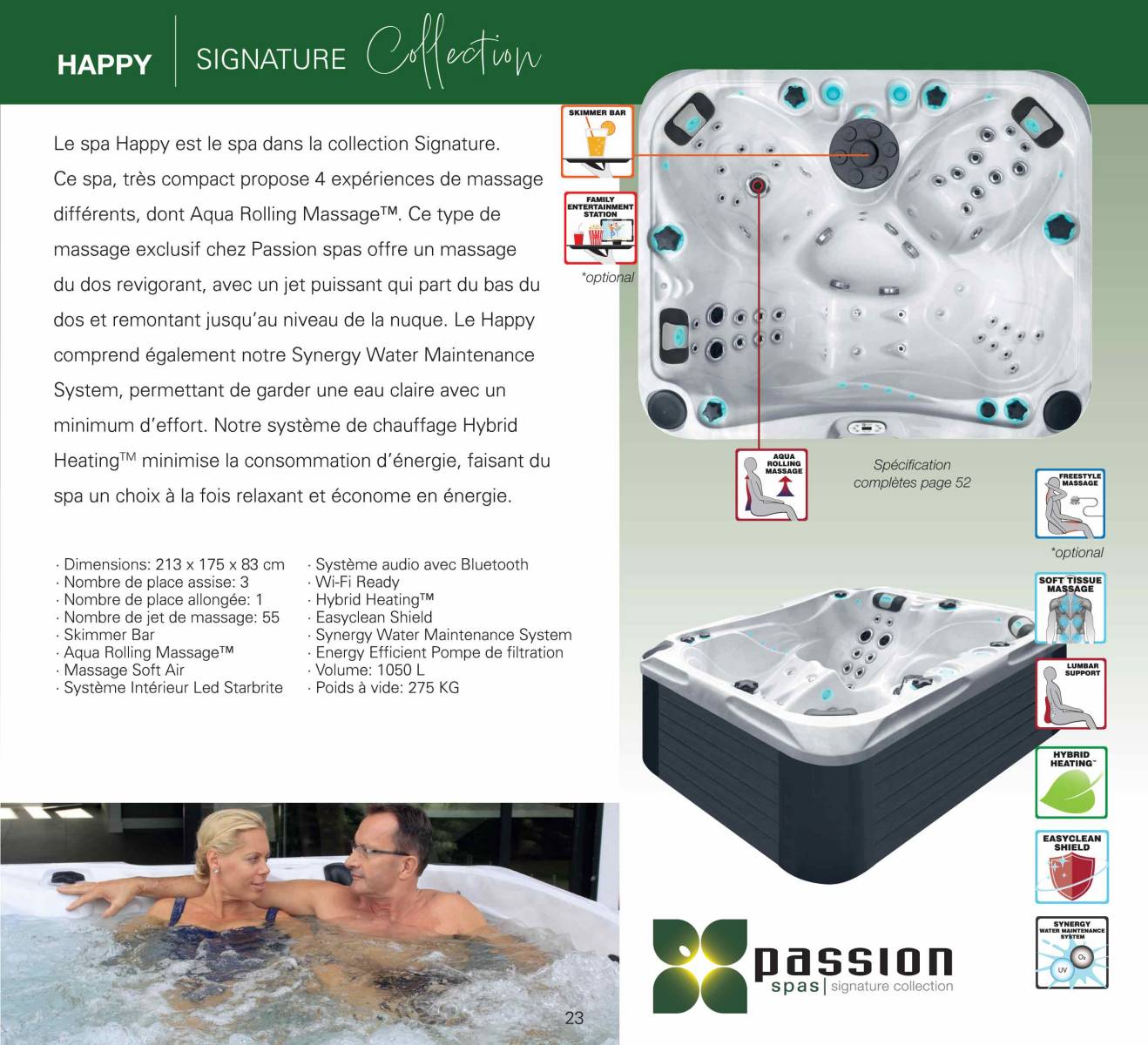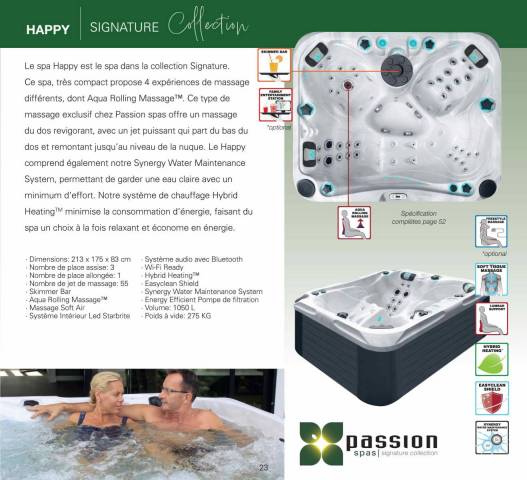 Le spa HAPPY très compact propose 4 expériences de massage différents, dont Aqua Rolling Massage. Ce type de massage exclusif offre un massage du dos revigorant, avec un jet puissant qui part du bas du dos et remontant jusqu'au niveau de la nuque. Le HAPPY comprend également le système de traitement par Ozone et UV permettant de garder une eau claire avec un minimum d'effort. Notre système de chauffage Hybrid Heating minimise la consommation d'énergie, faisant du spa un choix à la fois relaxant et économe en énergie.