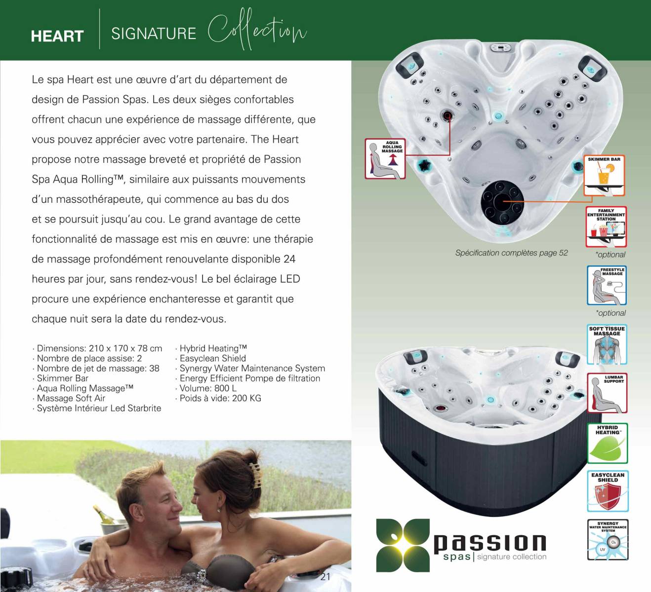 Le Spa HEART est une oeuvre d'art du département de design de Passion Spa. Les deux sièges confortables offrent chacun une expérience de massage différente, que vous pouvez apprécier avec votre partenaire. The Heart propose notre massage breveté et propriété de Passion Spa Aqua Rolling, similaire aux puissants mouvements d'un massothérapeute, qui commence au bas du dos et se poursuit jusqu'au cou. Le grand avantage de cette fonctionnalité de massage est mis en oeuvre: une thérapie de massage profondément renouvelante disponible 24 heures par jour, sans rendez-vous. Le bel éclairage LED procure une expérience enchanteresse et garantit que chaque nuit sera la date du rendez-vous.