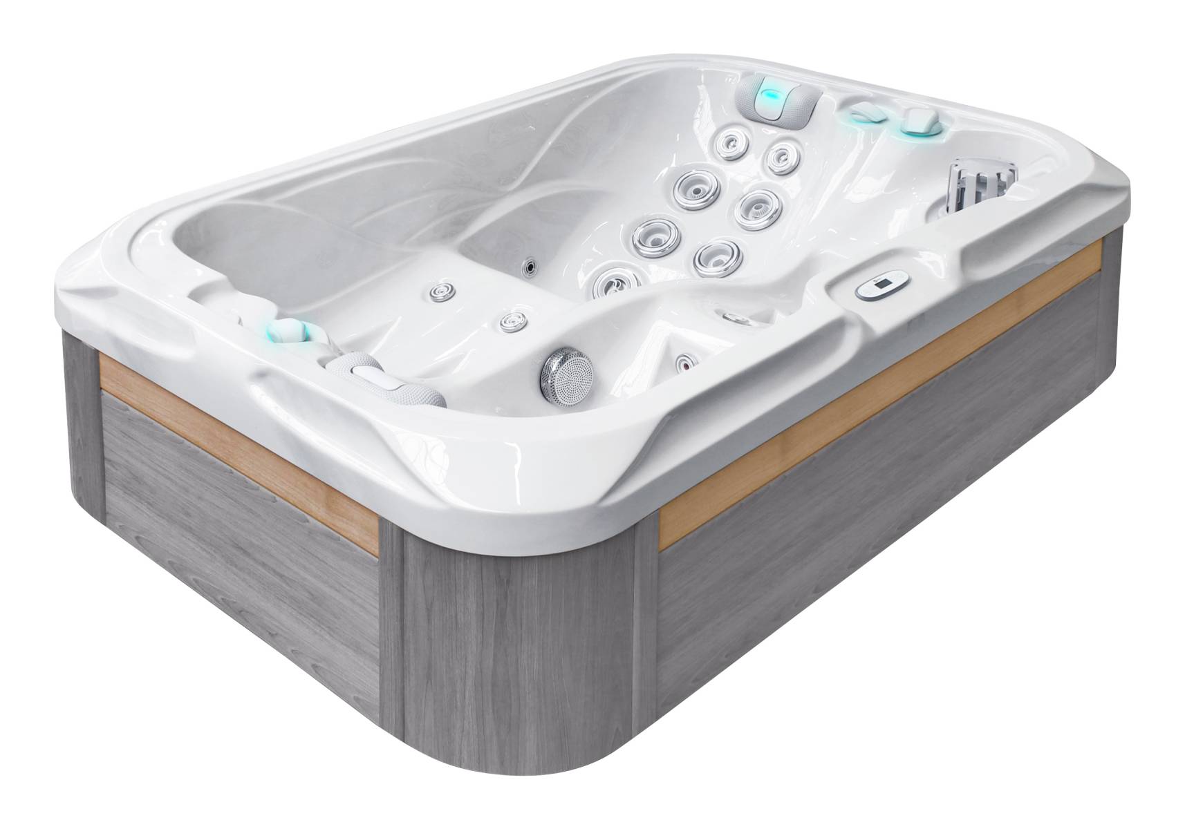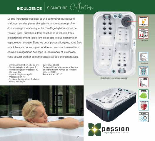 Le spa INDULGENCE est idéal pour 2 partenaires qui peuvent s'allonger sur des places allongées ergonomiques et profiter d'un massage thérapeutique. Le chauffage hybride unique de Passion Spa, l'isolation à trois couches et le volume d'eau exceptionnellement faible font de ce spa le plus économe en espace et en énergie. Dans les deux places allongées, vous êtes face à face, ce qui vous permet d'avoir un contact merveilleux et avec le magnifique éclairage LED lumineux et la casacade, vous pouvez profiter de nombreuses soirées enchateresses.
