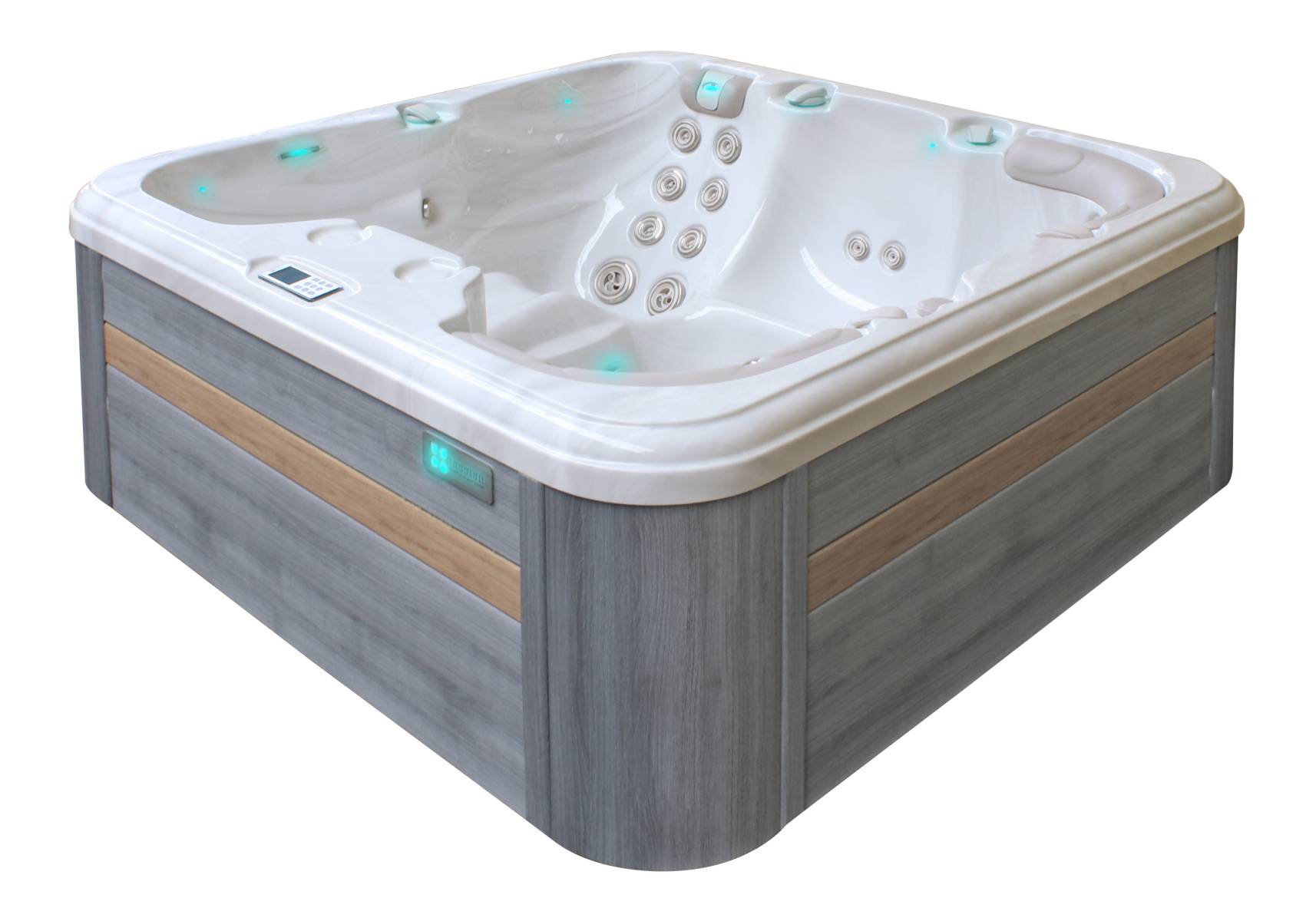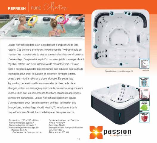Le spa REFRESH est doté d'un siège baquet d'angle muni de jets rotatifs. Ces derniers améliorent l'expérience de l'hydrothérapie en massant les muscles clés du dos et stimulant les tissues environnants. L'autre siège d'angle est équipé d'un nouveau jet de massage vibrant réglable, offrant une autre alternative de massothérapie. De petits jets Aquarolling ont été installés au niveau des jambes de la place allongée, créant un massage qui stimule la circulation sanguine vers le coeur. Bien sûr, les nombreuses fonctions standards appréciées, demeurent inchangées. Il est également équipé d'un ozonateur pour l'assainissement de l'eau, la filtration éco énergétique, l'aromathérapie et bien plus encore.