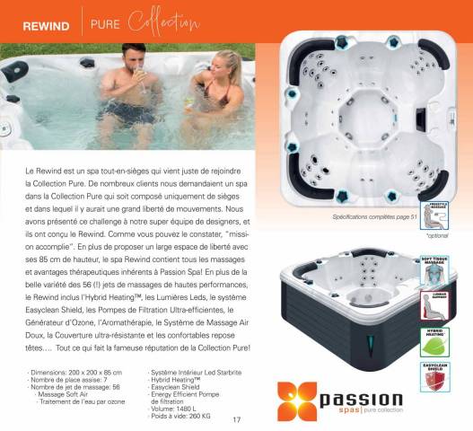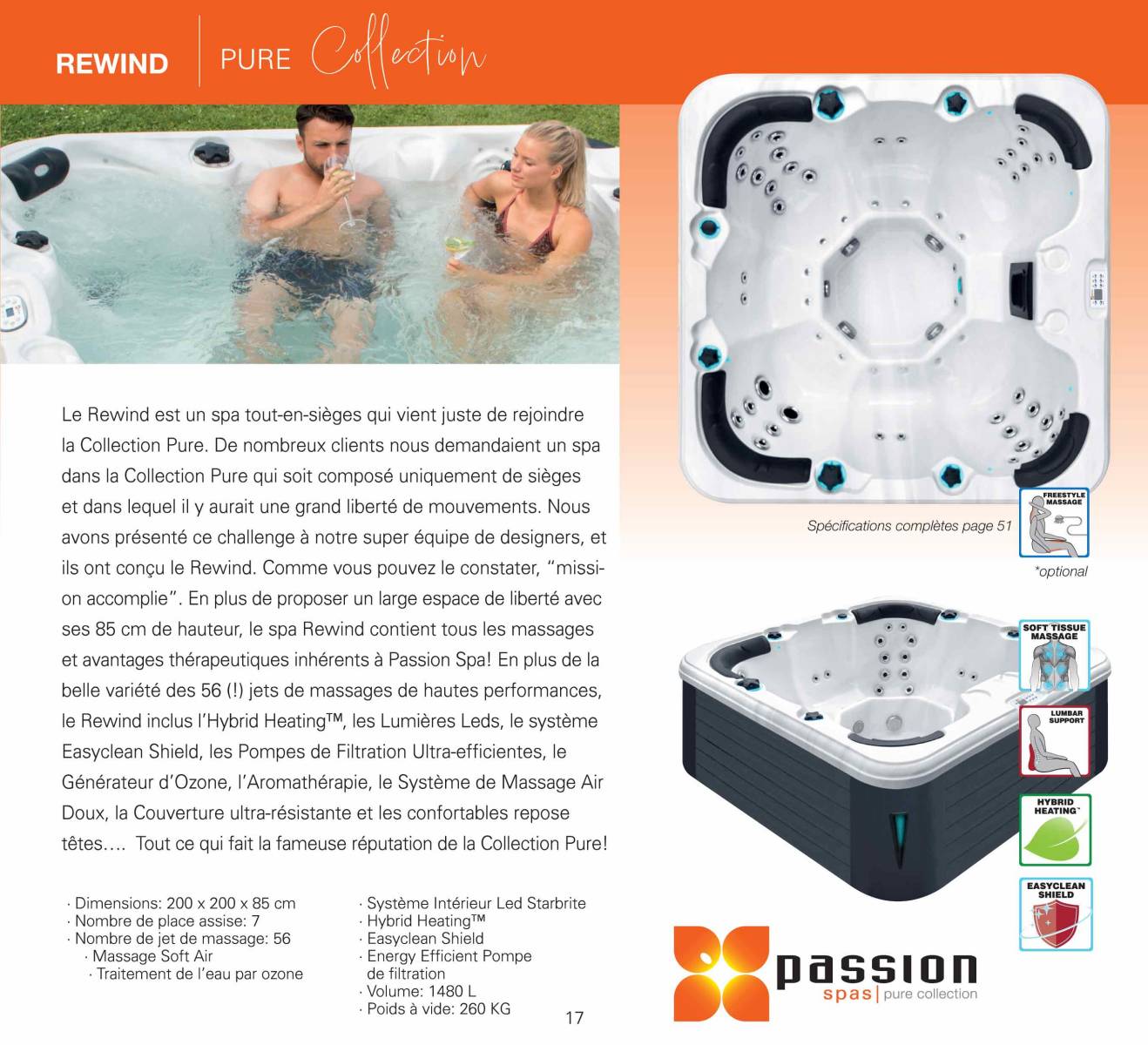 Le REWIND est un spa tout-en-sièges. De nombreux clients nous demandaient un spa qui soit composé uniquement de sièges et dans lequel il y aurait une grande liberté de mouvements. En plus de proposer un large espace de liberté avec ses 85 cm de hauteur, le spa Rewind contient tous les massages et avantages thérapeutiques inhérents à Passion Spa.
