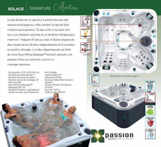 Le spa SOLACE est un spa pour 5 personnes avec des assises extra-larges au milieu rendant ce spa de taille moyenne plus spacieux. Ce spa a été conçu avec soin pour une relaxation optimale et un bénéfice thérapeutique maximum. Intégrant 58 jets au total, le Solace dispose de deux larges bancs, de deux sièges-baquets et d'une place en position allongée. L'un des sièges-baquets est doté de notre Aqua Rolling Massage exclusif, exerçant une pression d'eau sur votre dos, comme un massage vigoureux.